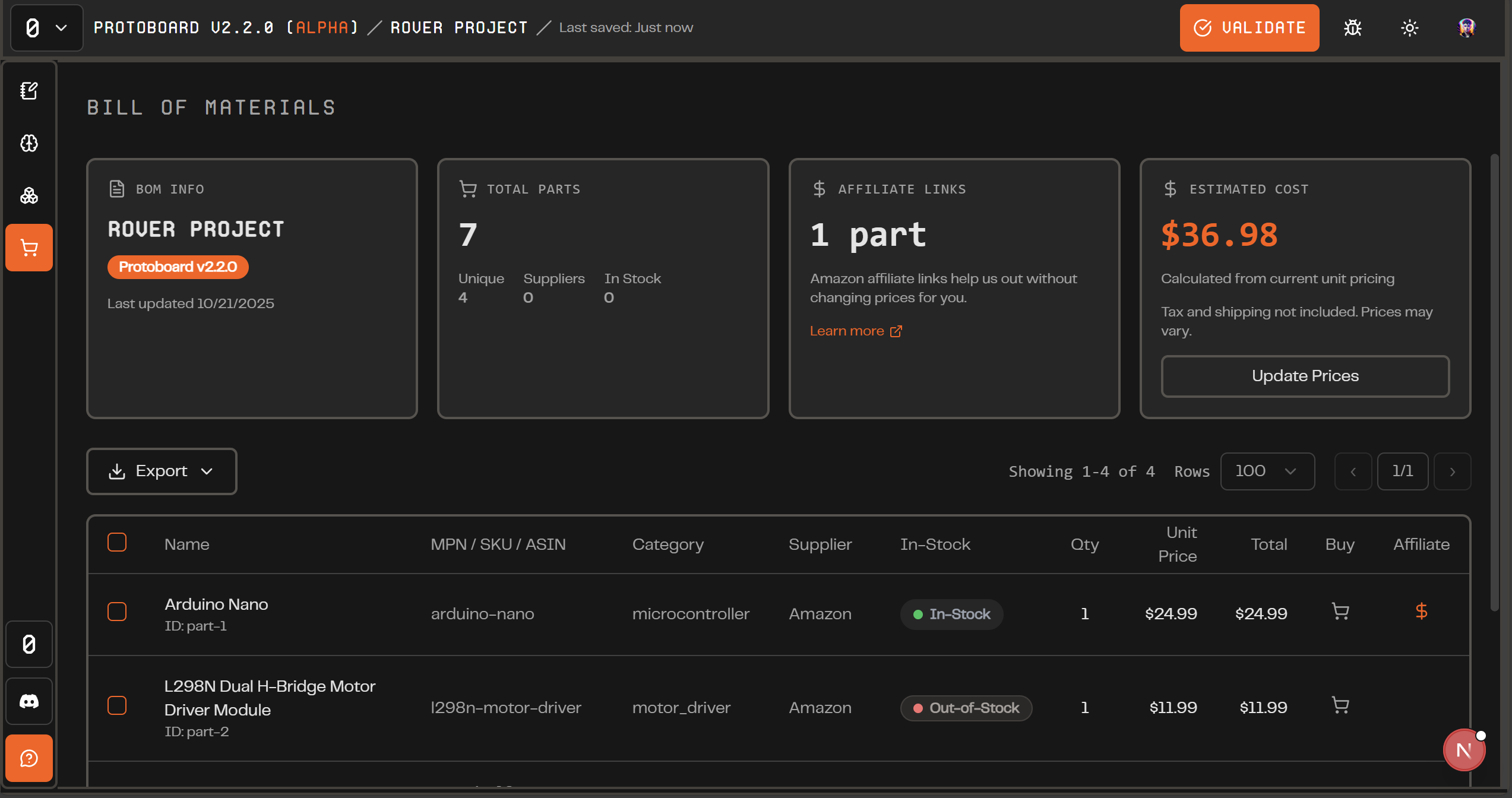 Bill of Materials: You can now export your entire parts list as a CSV or PDF. Each row includes Name, MPN/SKU/ASIN, Category, Supplier, In-Stock status, Quantity, Unit Price, and Total—complete with vendor links and live pricing when available.