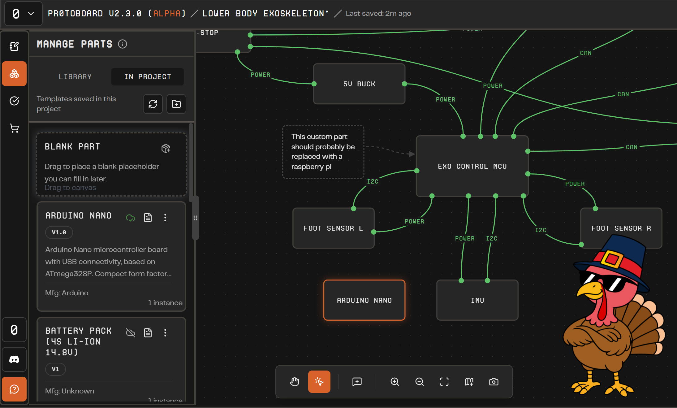 We see a gap in our ability to represent all parts that can exist, so we are making some updates that will allow our users to add custom parts more easily and manually represent their system without needing to rely on our smart Protopart definitions, which are limited to <60 parts. We hope that soon every system diagram will be representable in Protoboard, even if we do not have the parts in the library with full support for you to manually configure connections, pins, BOM info, etc.