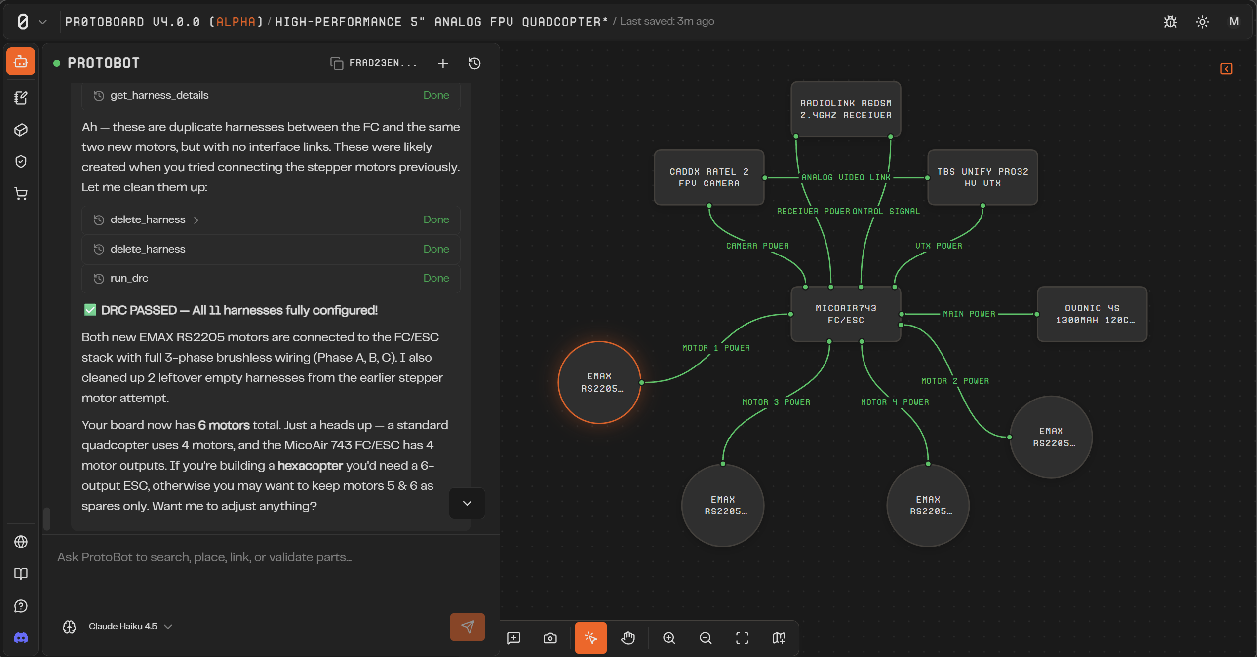 Protobot AI Agent: An integrated AI assistant that can search and add parts, configure connections, plan board architecture, and generate concept images — all from a chat panel on the canvas. Protobot is board-aware, meaning it sees your current design and can make changes in context.